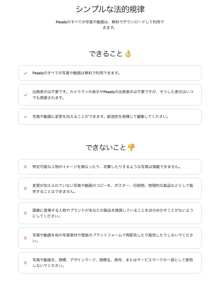 しかし、Pexelsを利用する限り、そのストレスは完全にゼロになります。 Pexelsで提供されているすべての写真と動画は、「Pexelsライセンス(実質的にCC0に近い非常に緩やかなライセンス)」の下で提供されています。