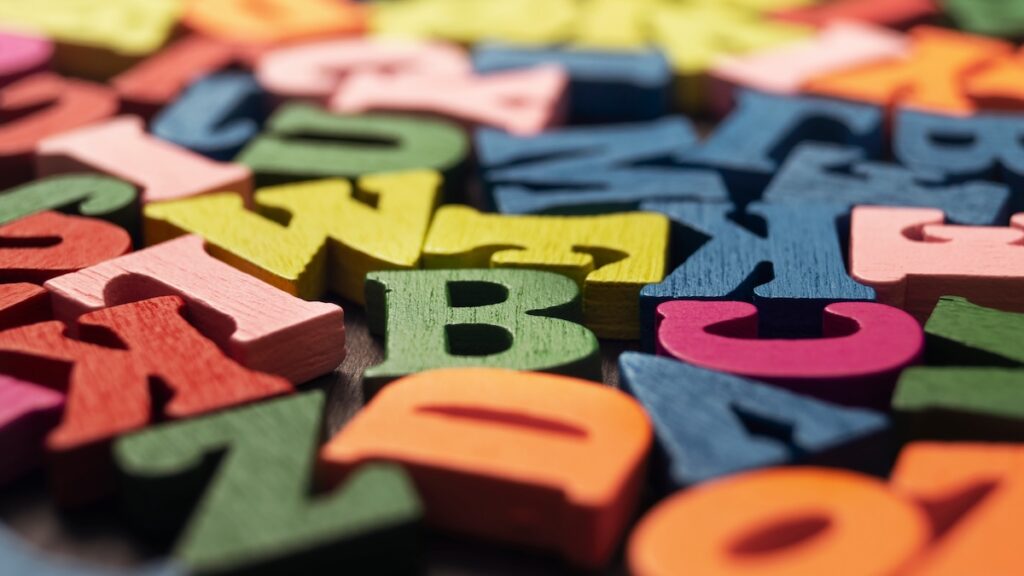 Colorful wooden letters on wooden background, shallow depth of field