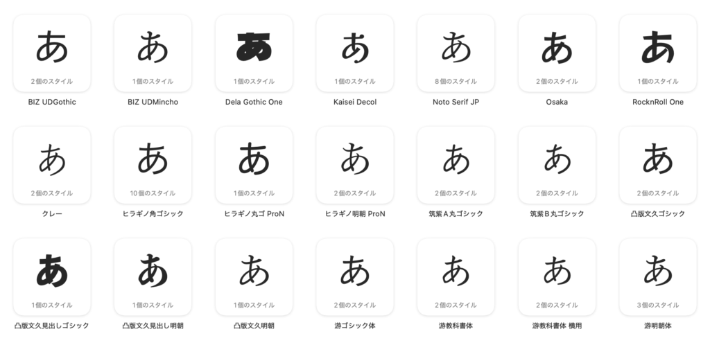 • 本文用: 癖がなく、可読性が高く、細めのウェイト(太さ)が揃っている。